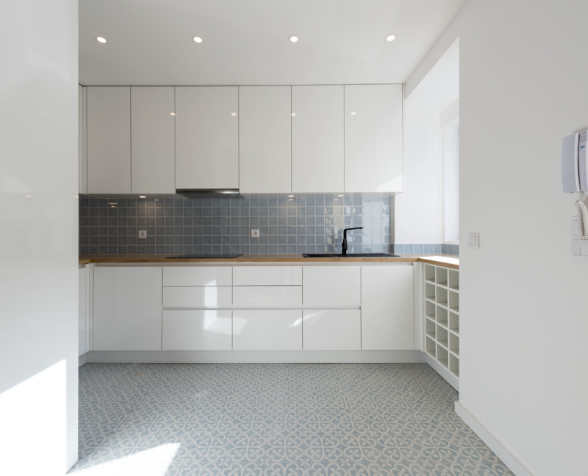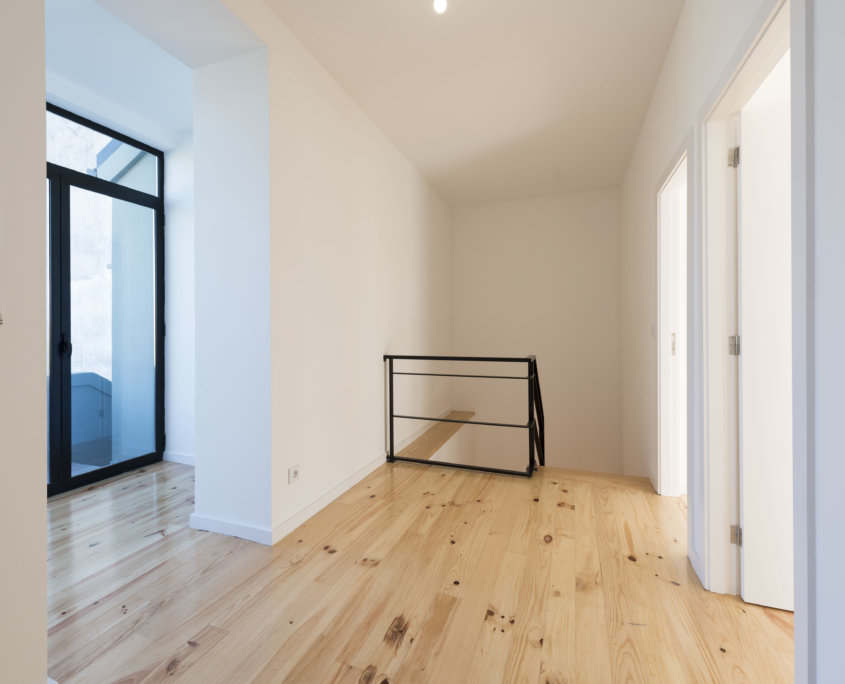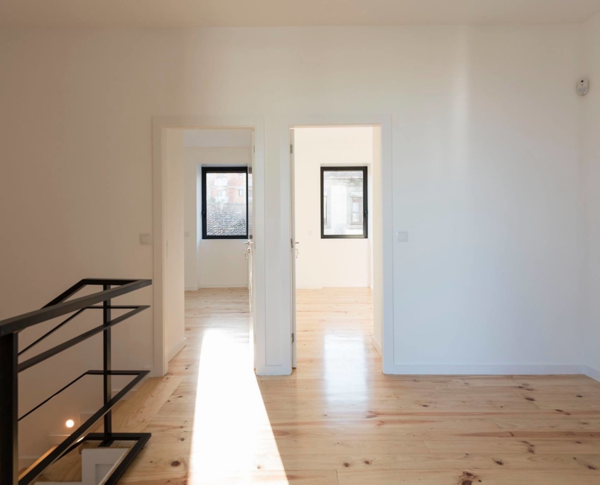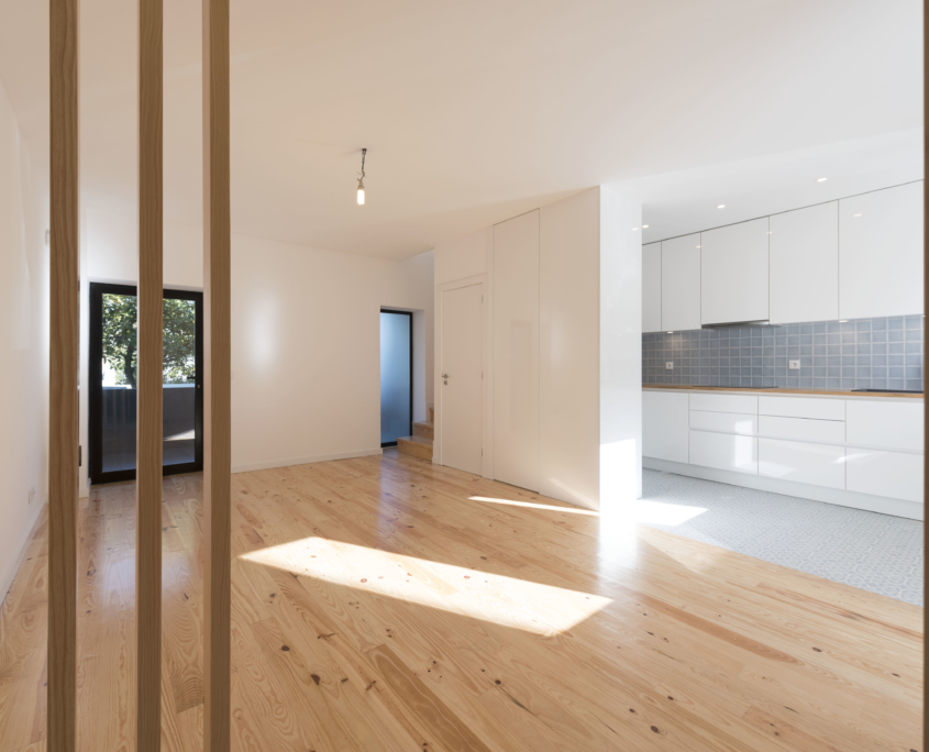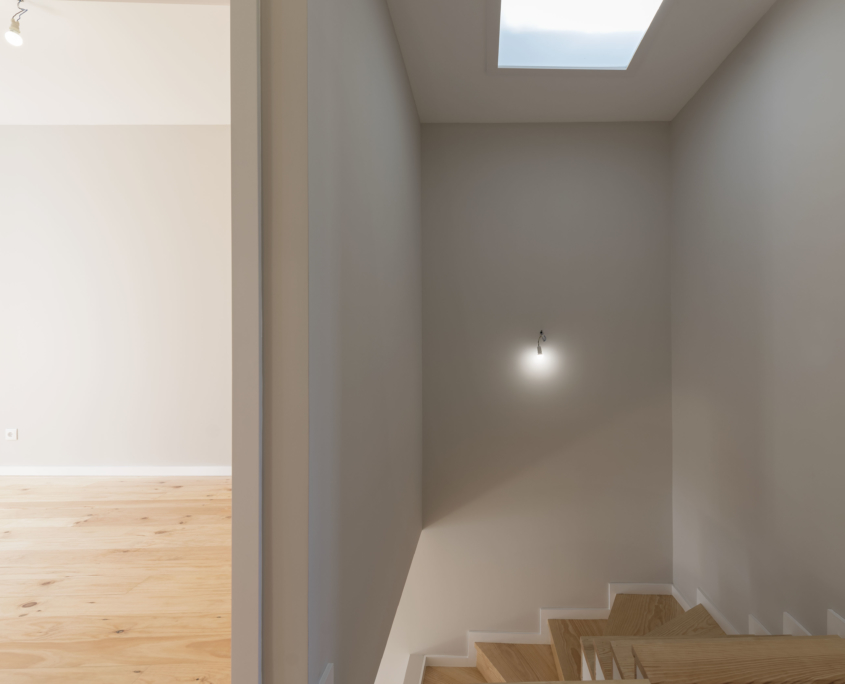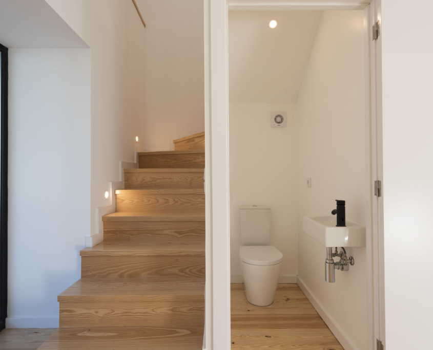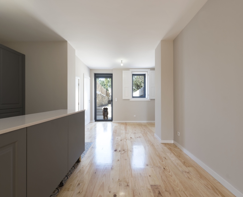 Cobertura tradicional, estrutura de madeira, pavimentos em soalho de pinho, portadas existentes totalmente reabilitadas e esmaltadas no local, portas e rodapés lacados a branco foram alguns dos trabalhos executados que conferiram a esta casa um espaço harmonioso, cheio de luz e vida para receber a sua nova família.