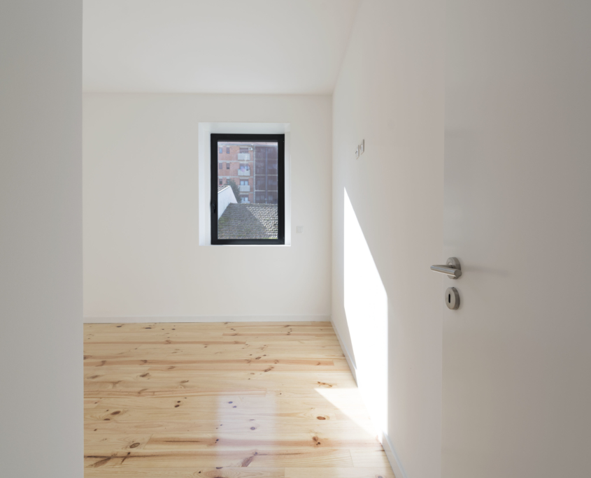 Ao nível do R/Chão foi criada uma zona social composta por casa de banho, sala e cozinha, no 1º andar dois quartos com roupeiro, uma casa de banho completa e um escritório com vista para o logradouro através de um envidraçado que se estende ao longo de toda a fachada traseira.